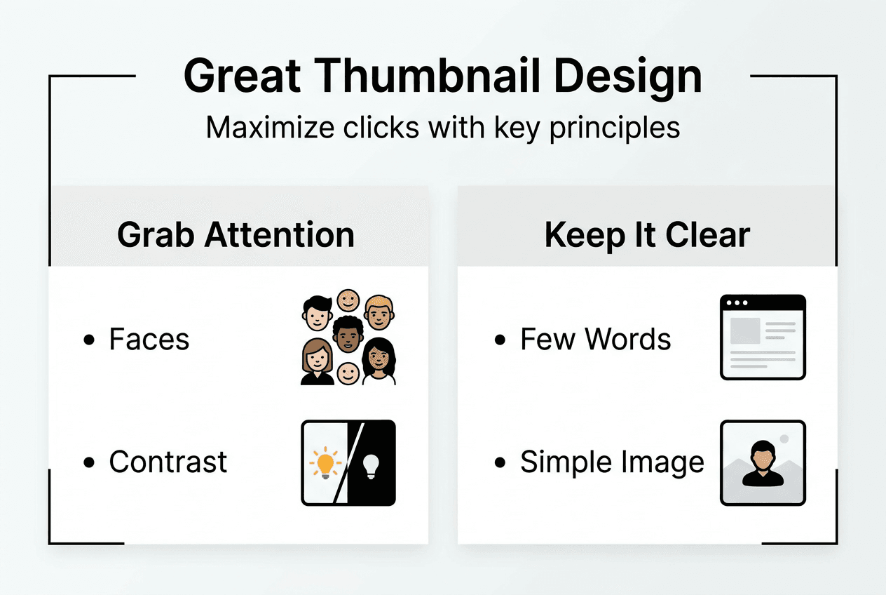 | Faces and contrast boost performance | Thumbnails with faces increase CTR by up to 20% while bright colors improve visibility. |